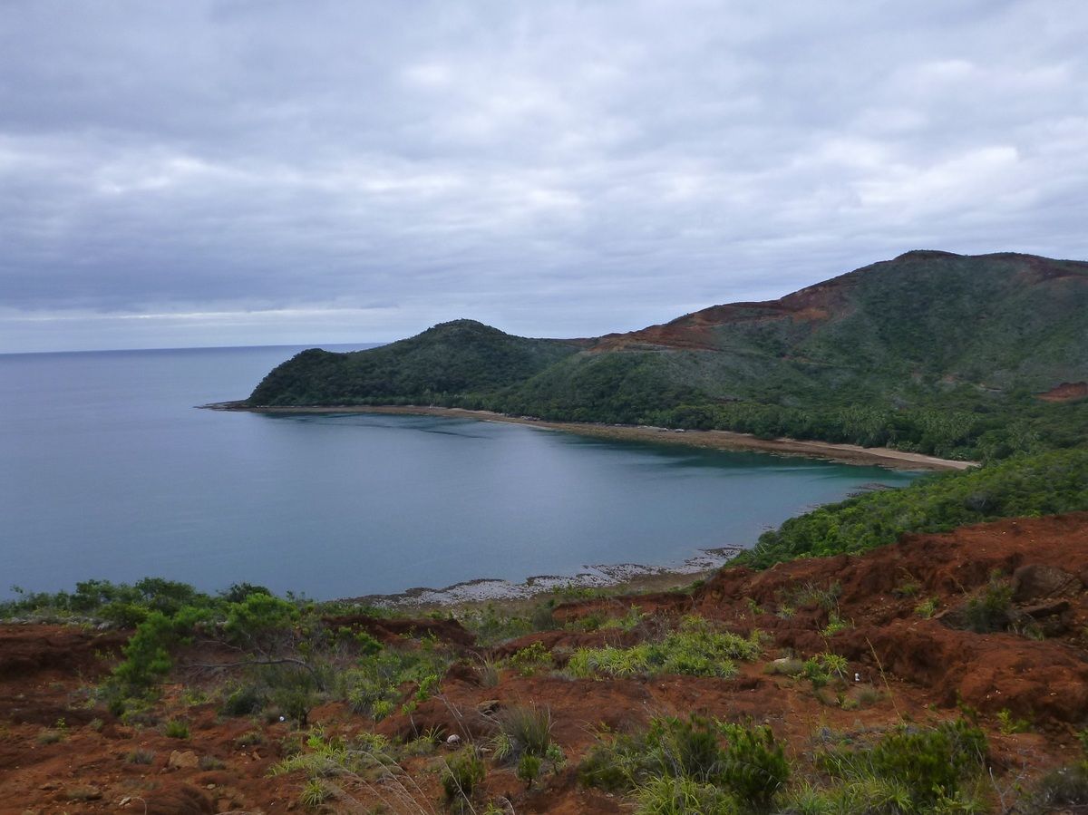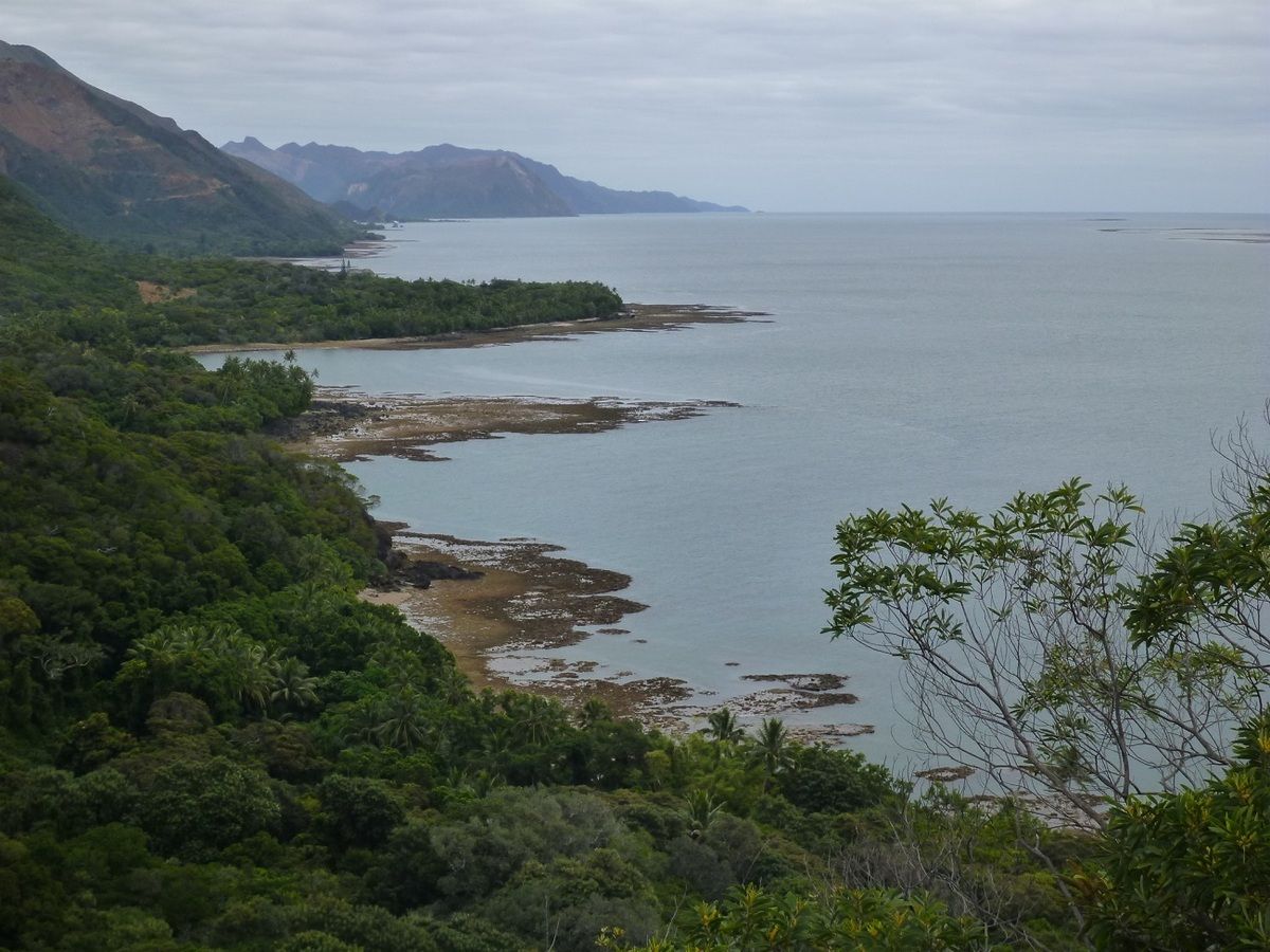 De Thio, petite bourgade minière, j’emprunte la route côtière vers le sud-est sur une dizaine de kilomètres (route en impasse vers Saint Roch), jusqu’à un petit col qui offre une vue dégagée sur cette portion de côte.